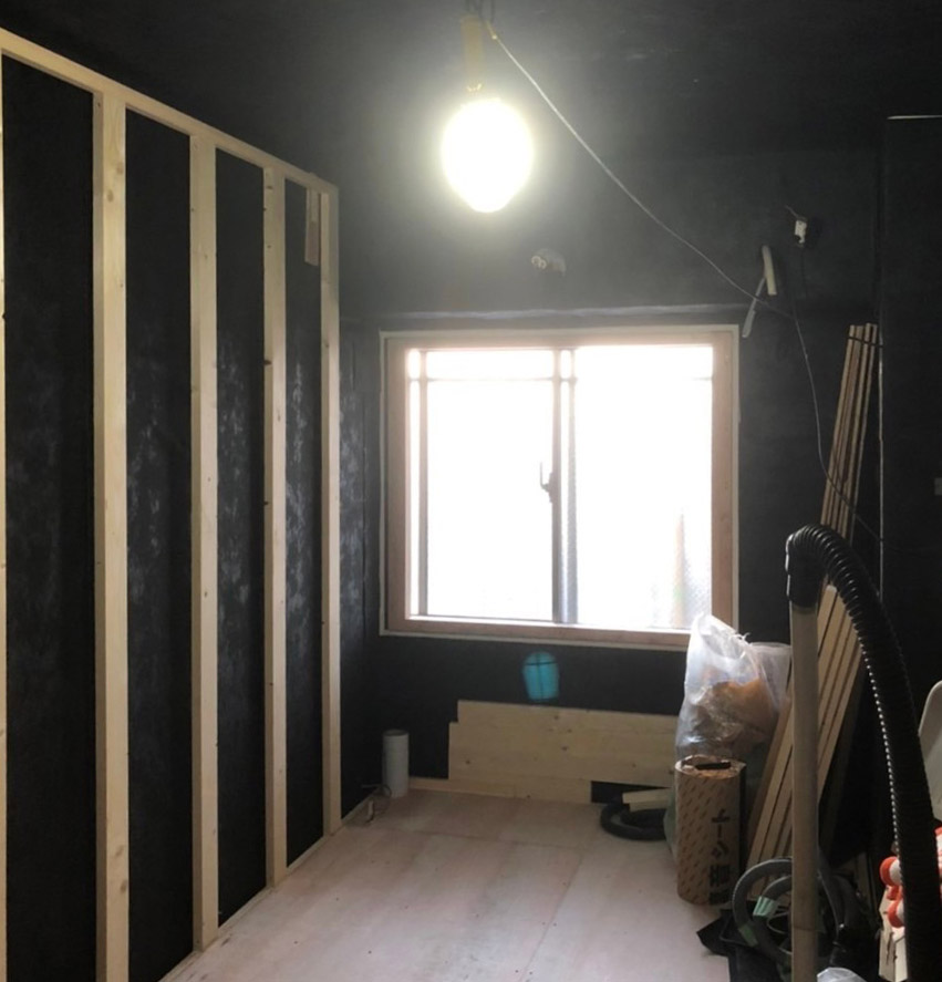 今日の現場 壁と天井に最初の防音シート貼り完了。これから更に数層の遮音層をつくります。 窓の内側に追加する… -