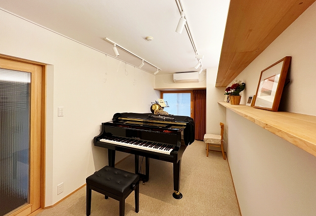 音楽好きな家族のための防音室ができあがりました。ピアノを始めオーボエやホルンなどの演奏を楽しむお部屋です。 換気したいと… -