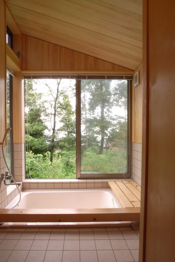 浴槽を床面まで埋込み、周囲に桧の腰掛けを設置しました。 腰かけて足湯としても利用できます。 林を眺めながらの入浴は… -