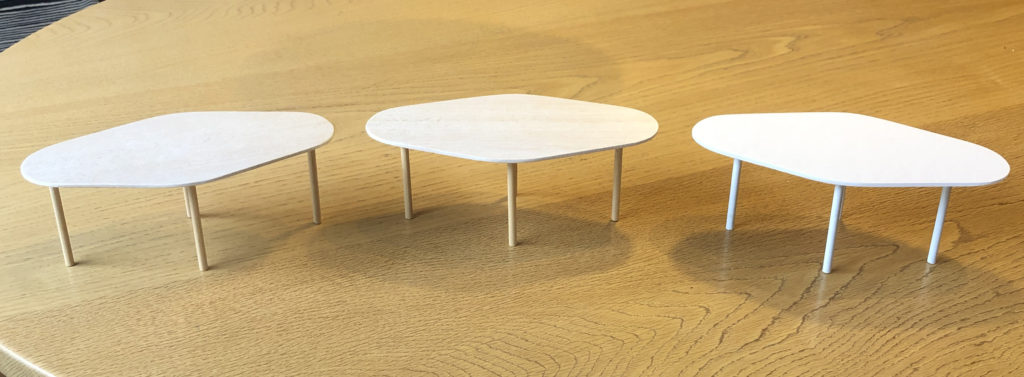 計画中のテーブルの大きさを確認するための型紙です。先日の模型より長さを短くし、菱形の角度を変えて2種類用意。実際に所員と座って… -