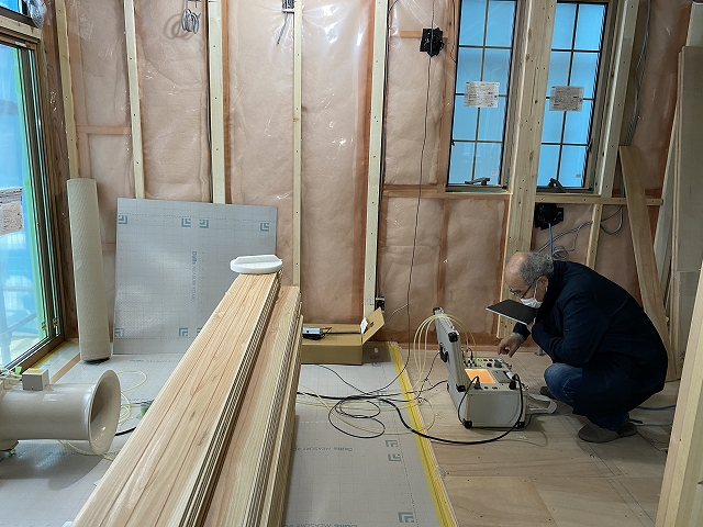 マニュアルに従って操作中 新築中の住宅で気密測定を行いました。測定機を窓に設置し、室内を減圧して内外気圧差と風量を測定し… -