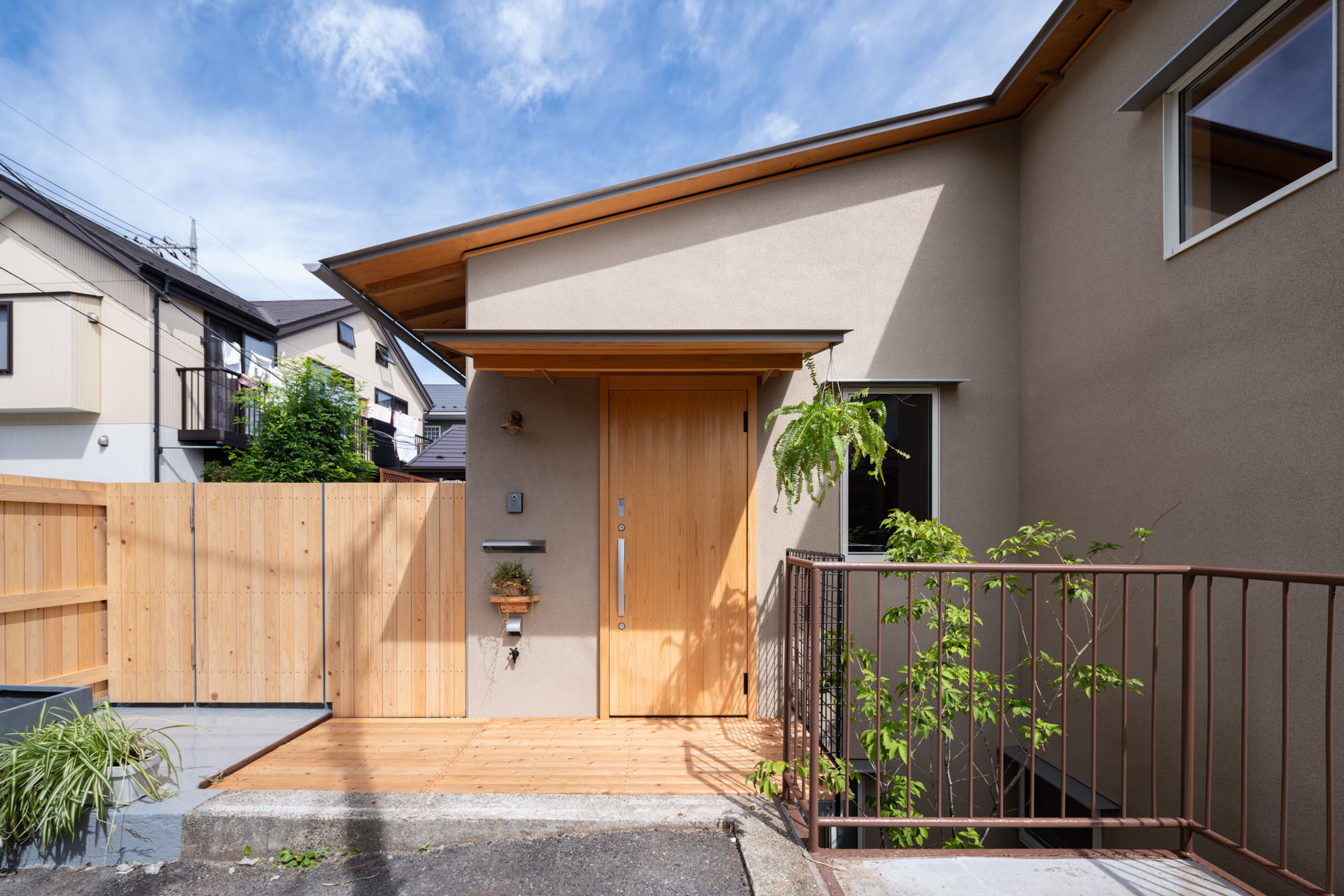 道路面から玄関を見ると、平屋に見えますが2階建てです。