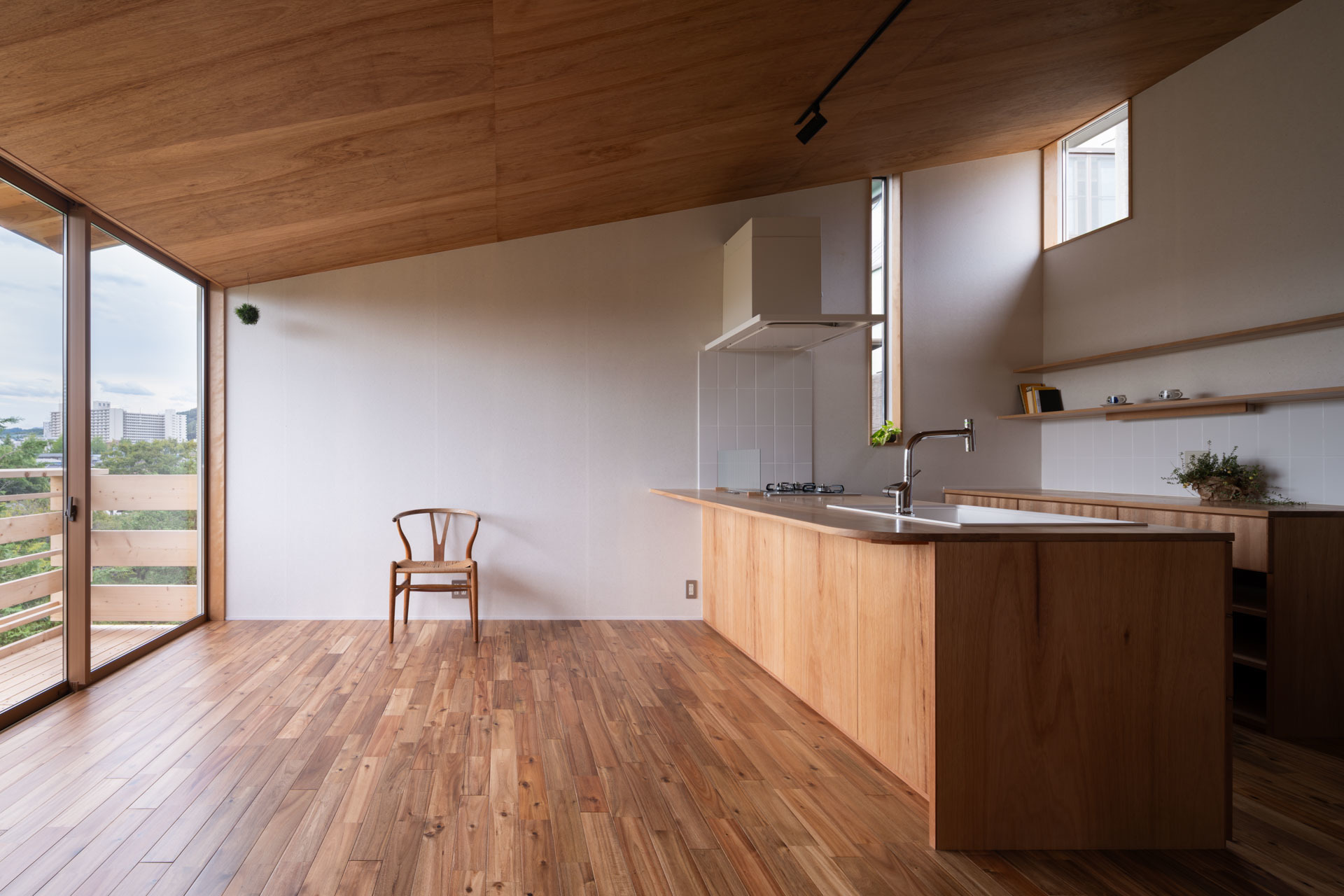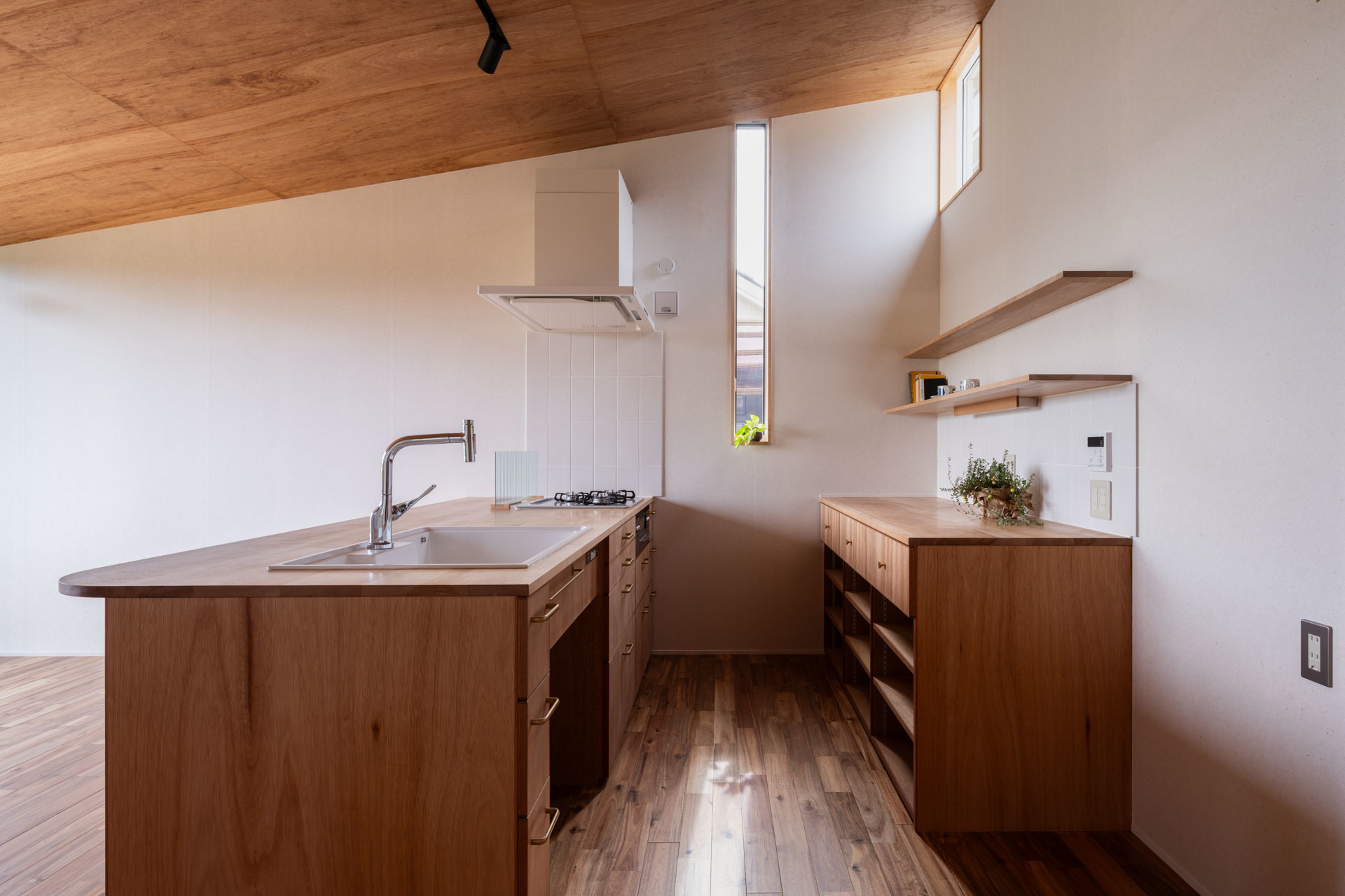 キッチンカウンターはカバの巾剝ぎ材を使用した造作キッチンです。
