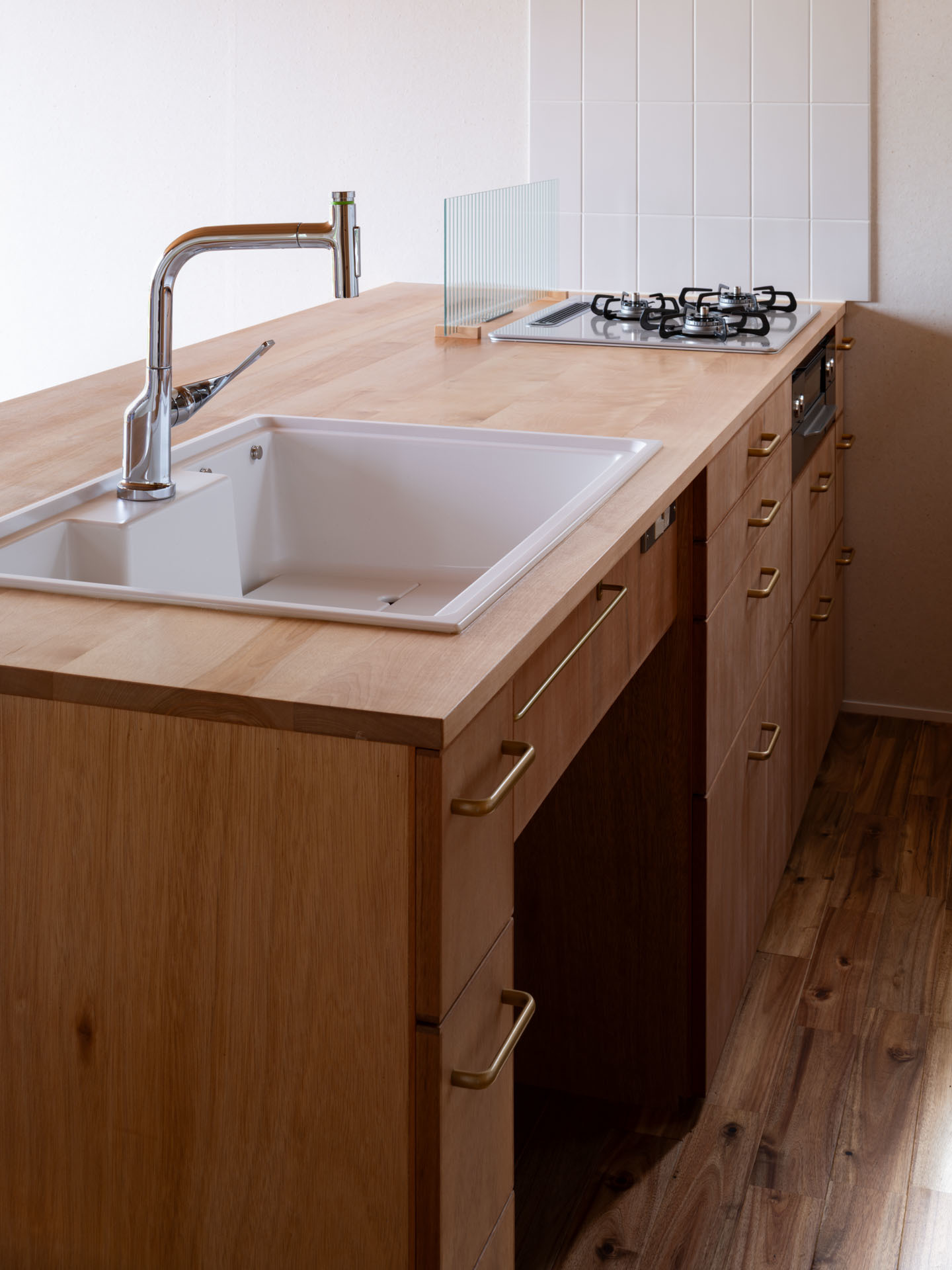 キッチンシンクは高硬度人工大理石のオーバーシンクを建て主さんが見つけてきてくれました。