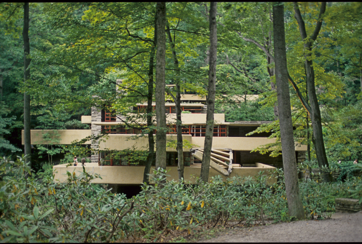 ライトの落水荘は、世界で最も訪問者の多い住宅の一つでしょう。私が落水荘を訪れたのは1982年。坂を下りながら初めて見た姿にエエー!とびっくり。右側の翼のような庇が折れている! 覆い被さるように張り出していた木の枝が暴風雨で折れて直撃したのだそうです。