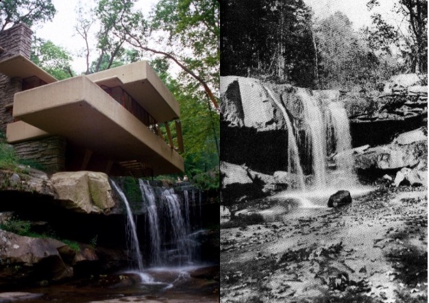 右写真:建設以前の滝。カウフマン一家はここでよく水遊びをしたという。