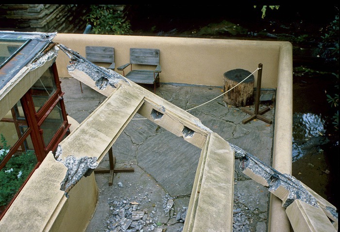 実は落水荘は何度か鉄砲水の被害にも遭っています。建設前に岩の上に建設するのは危険だと指摘されていたこともあったようです。あまりにも大きな跳ね出し構造に不安を抱いた施主カウフマンが、セカンドオピニオンを求め、施工者がライトの許可を得ず鉄筋量を増やしてコンクリートを打設してしまい、ライトと決裂寸前まで険悪な状態にもなったこともありました。