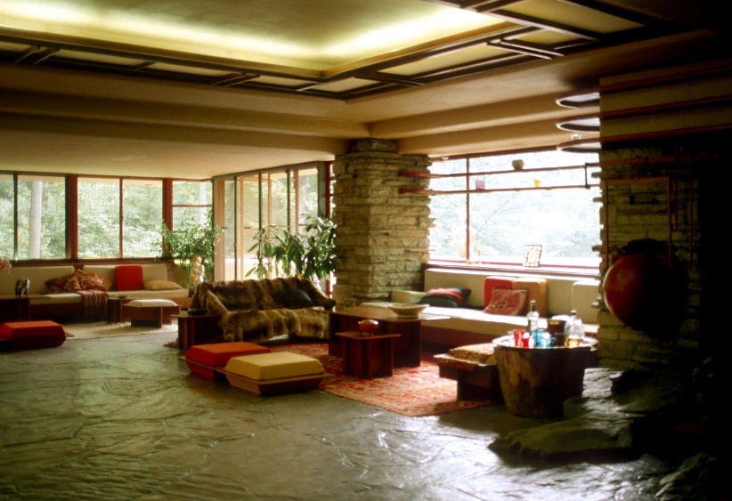 写真の右側の床にはりだしている岩は元々この場所にあった岩棚です。落水荘が建設される以前、施主のカウフマン一家は、滝で水遊びをした後この岩の上で日光浴をしたそうです。このポイントが建物の配置と高さの基準となりました。赤い球は暖炉にかざすヤカン。右に回転させると火床の上に移動できます。ほとんど使われなかったそうですが。