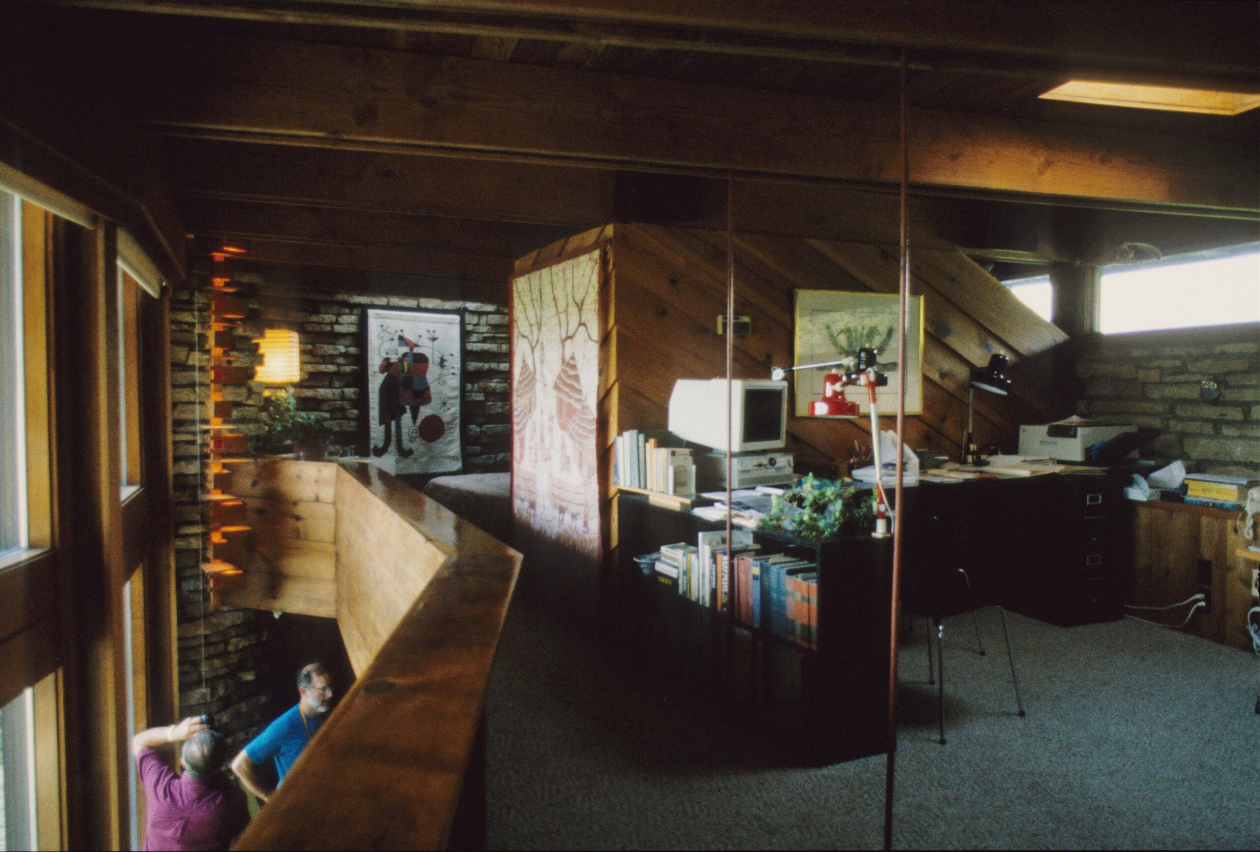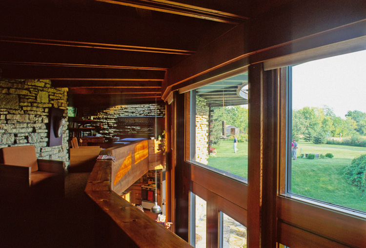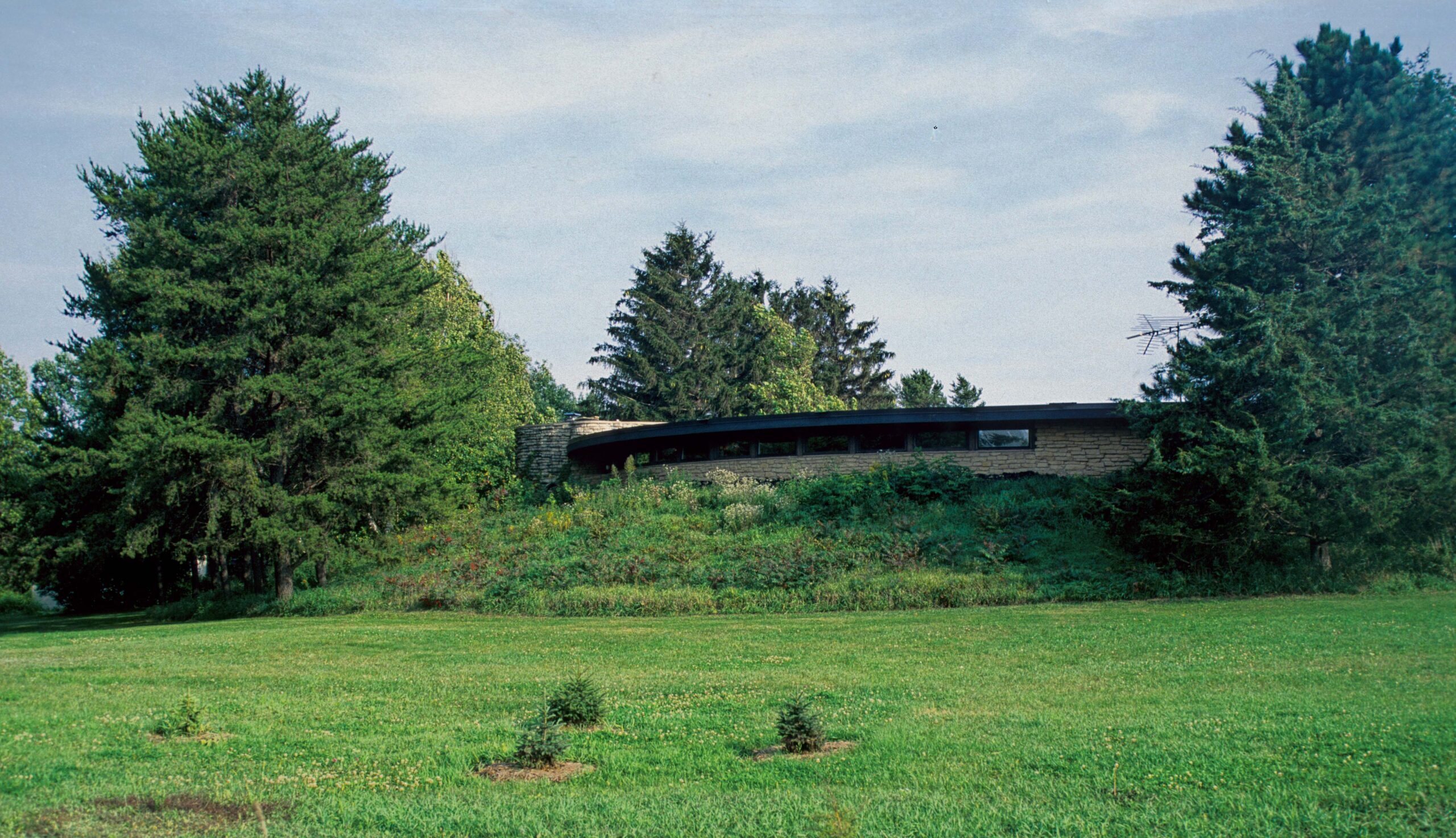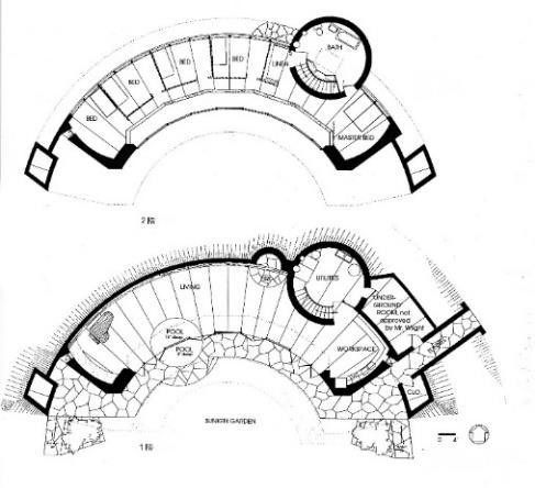 ライトが新たに提案したのはパッシブソーラーハウスでした。大きく湾曲した石積みの壁と同心円のガラス面に囲まれた扇型は室内に冬の日射を最大限取り入れるための形です。敷地は開けた平坦な場所でしたが、ライトは中庭を円形に1メートルほど掘り下げその土を北側の石積壁の周りに盛り上げました。土で覆うことによって年間を通じて安定した地下室の暖かさと涼しさを手に入れ外壁の仕上げを節約しました。