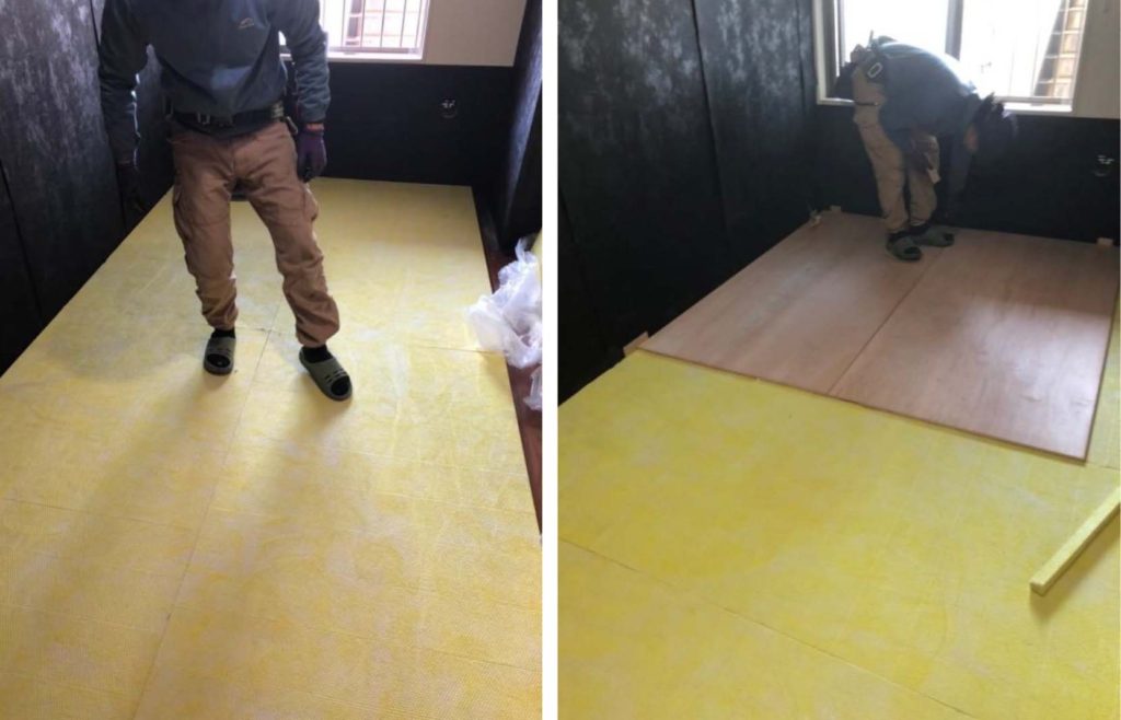 部屋の中に防音箱を組み込む簡易な方法では無く、部屋に合わせて本格的な防音工事を行います。まずは、既存の床・壁・天井を遮音シートで覆ってから乾式の浮き床をつくります。コンクリートの床に音を伝えないための工事です。