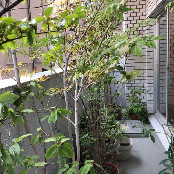 半田事務所はビルが建て込んだマンションの一室にあります。狭いバルコニーですが、コナラ、アオダモ、シマトネリコ、シャラ、ヤマボウシなどの鉢が置いてあります。植栽の実物サンプルです。そのコナラにドングリがなりました。