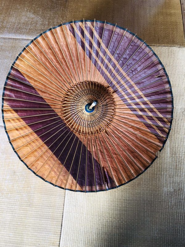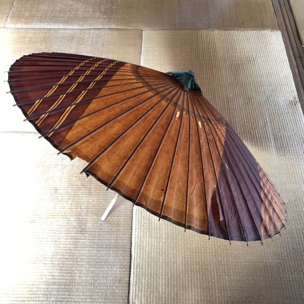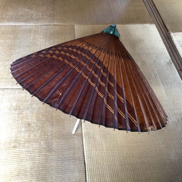 物置を整理していたら番傘が出てきた。少なくとも5,60年以上昔のもの、もしかしたら戦前の物かも。なんとか開いた。二段階に開く機構になっていて、柄もイキ。