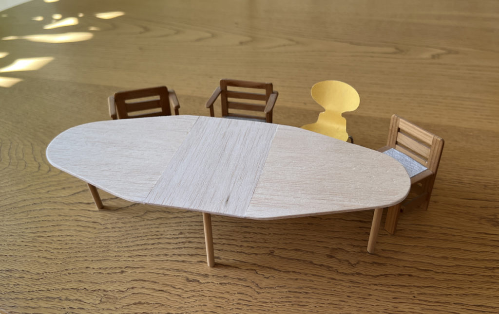 2022.11.02 食卓拡張 昨年作らせていただいた菱形の食卓を大きくしてほしいとのご要望が有り、拡張案を作りました。 二つに分割して中央に60cmの板を挿入予定。最大10人で食事ができるサイズです。脚は再利用。 竣工当時の食卓 オリジナルサイズ模型 拡張案模型 長さ2.4m シェアする ポスト カテゴリー: 住宅家具 タグ: 住宅 関連記事 2026.01.06 新しい年になりました 住宅新年注文住宅設計設計事務所 2025.12.10 個室の変遷、今は書斎 住宅半田雅俊半田雅俊設計事務所家づくり建築建築家戸建書斎板橋窓辺緑が見える家設計事務所 2025.11.19 高台のちいさな家 竣工写真1 住宅公園半田雅俊半田雅俊設計事務所家づくり崖地建築建築家戸建木造設計事務所高台 一覧に戻る ← 前の記事へ 次の記事へ →