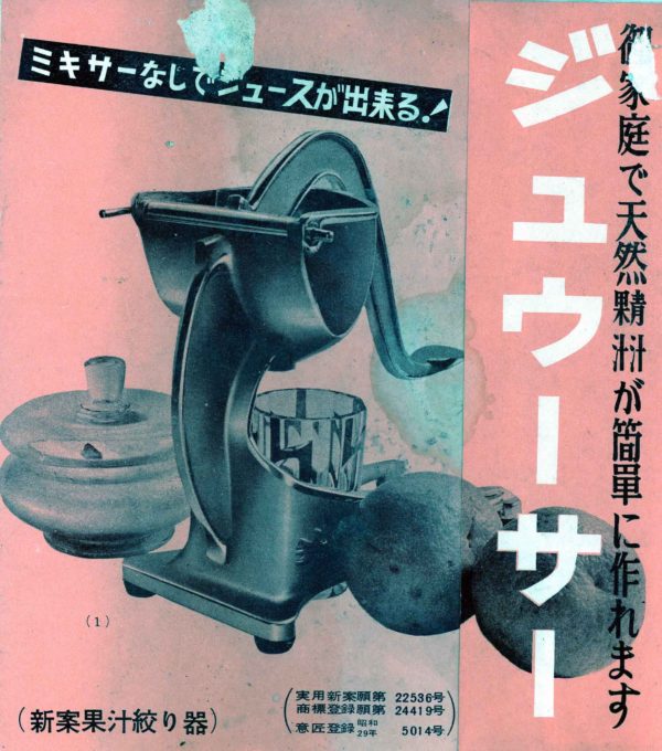 実家の片付けをしていると、昔の道具がゾロゾロ出てきます。これはジュウーサー。果物などを押しつぶして果汁を搾るもの。似たような器具(ジューサー)は、今でもありますがカタカナのウと効用書きとは時代を感じさせます。 説明書には、(新案果汁絞り器)意匠登録昭和二九年とあります。ジュースがまだ一般的な飲み物ではなかった時代でした