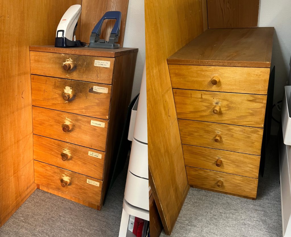 事務所の図面引出をきれいにしたら、 傍にある文房具引き出しの汚さが目立ってきた。 つまみ周囲の白い傷は爪の痕。シナ… -