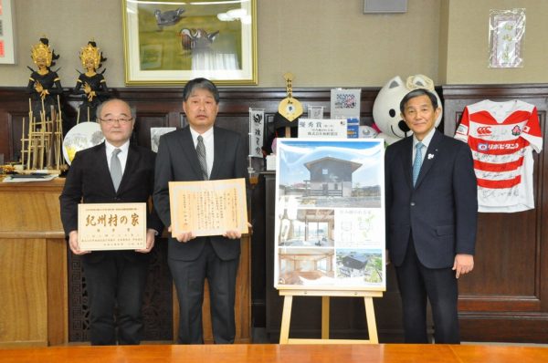 右:和歌山県知事 中央:和秋建設前田社長 左:半田 和秋建設:施工、設計:半田雅俊設計事務所 「住継がれる家」が、 わかやま… -