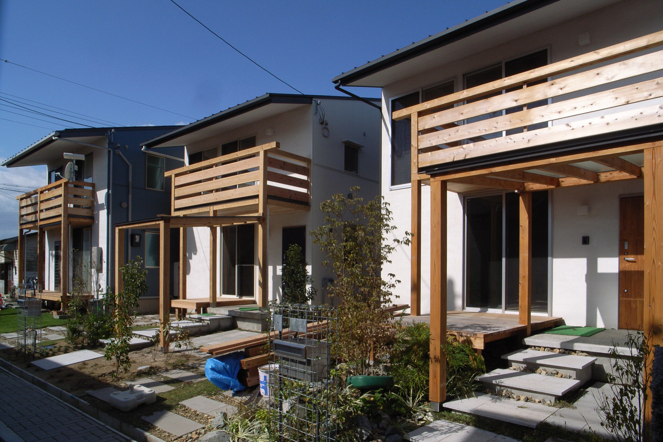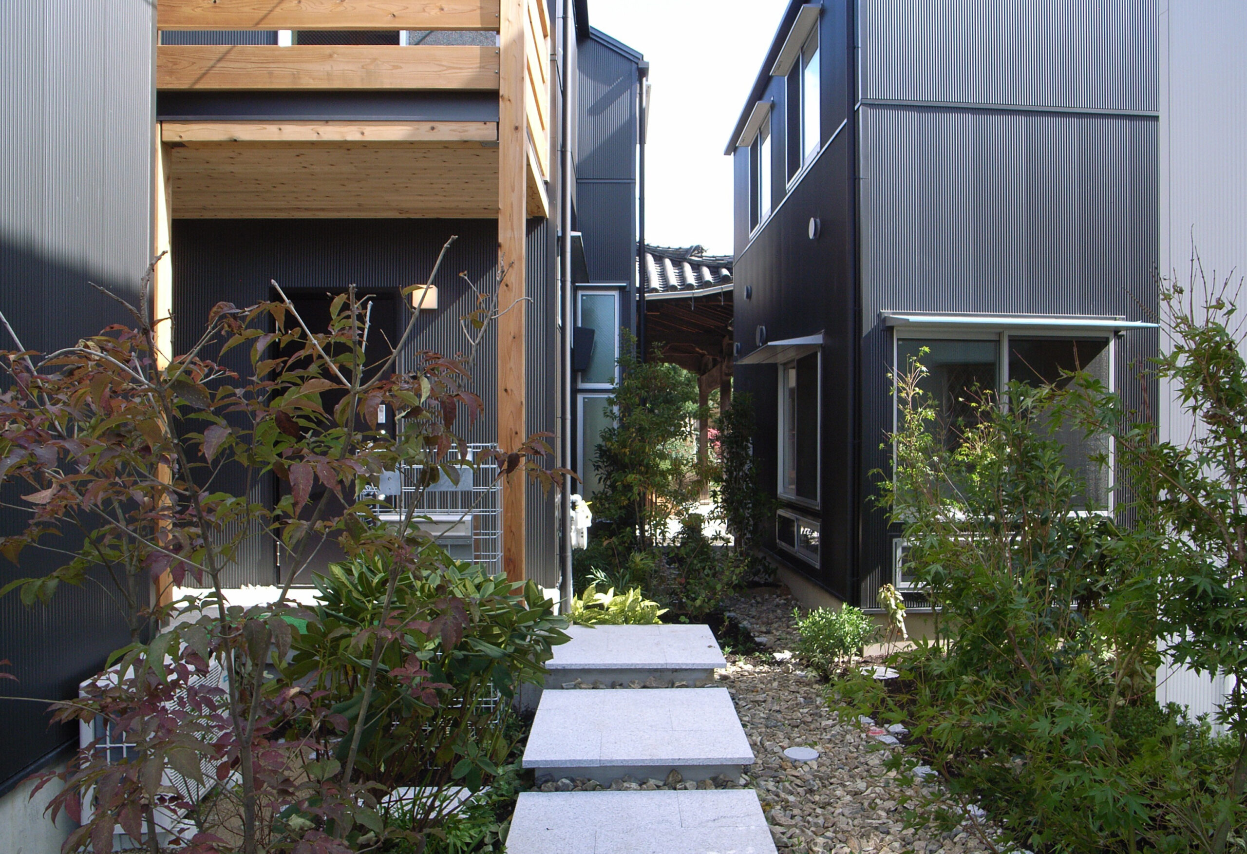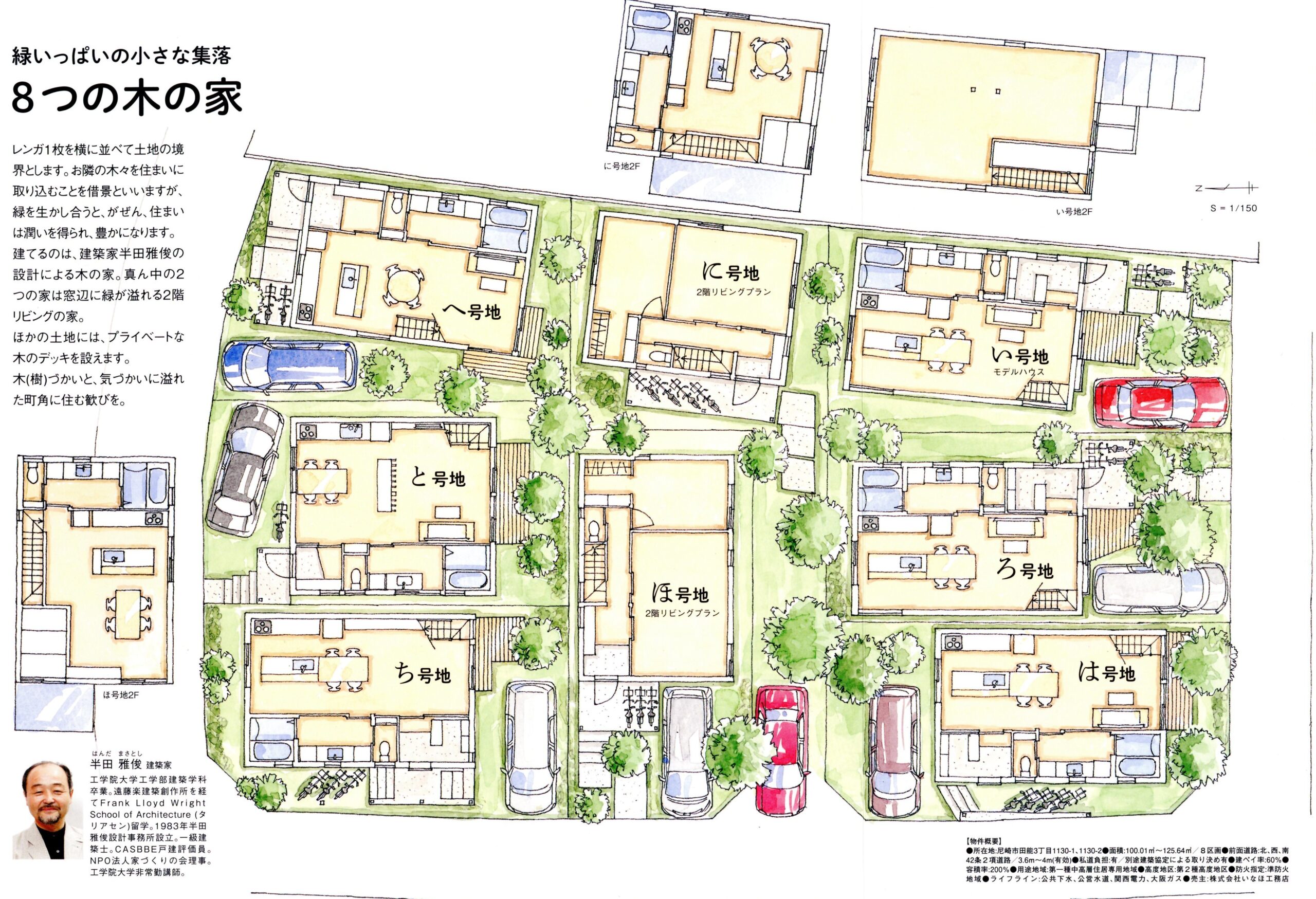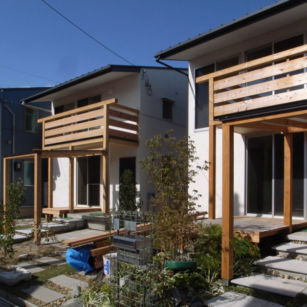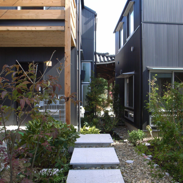8戸の分譲住宅です。敷地境界に塀を設けず、小さな敷地ながら緑を共有して潤いのある街並みをつくりました。