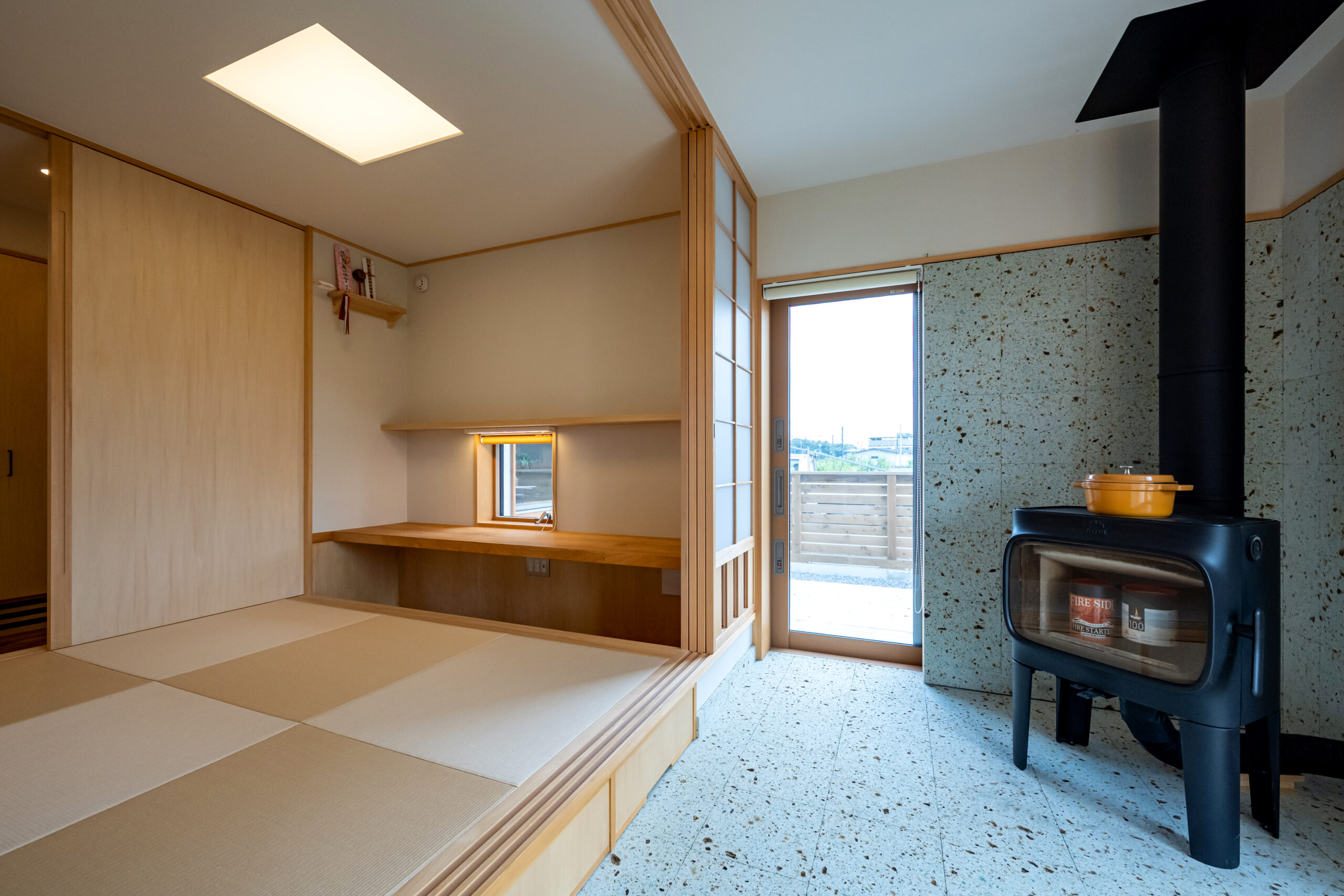 奥には和室小上がりと薪ストーブがある