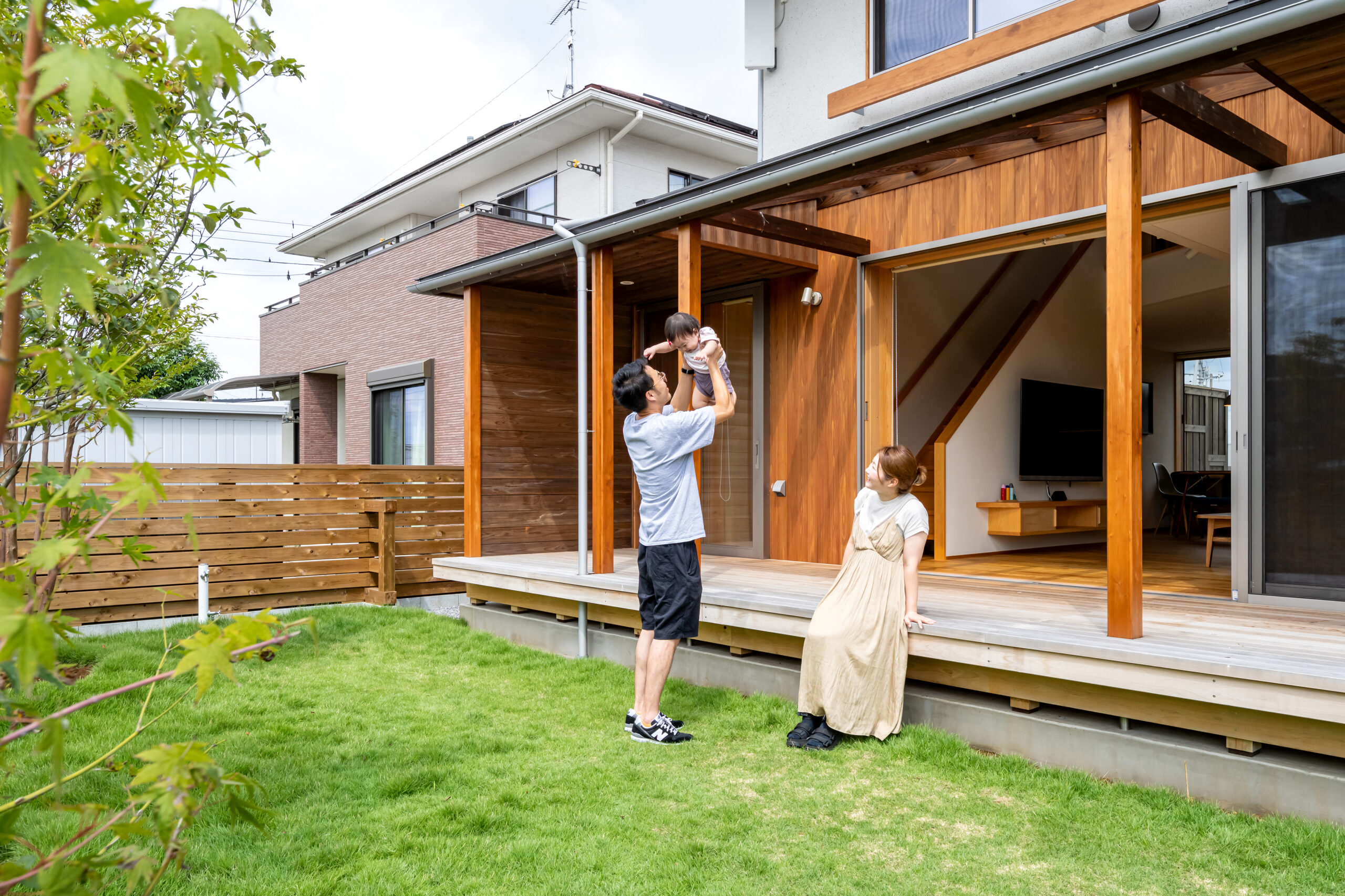 リビングとつながったデッキに腰をかけて、のんびり過ごせる広い庭