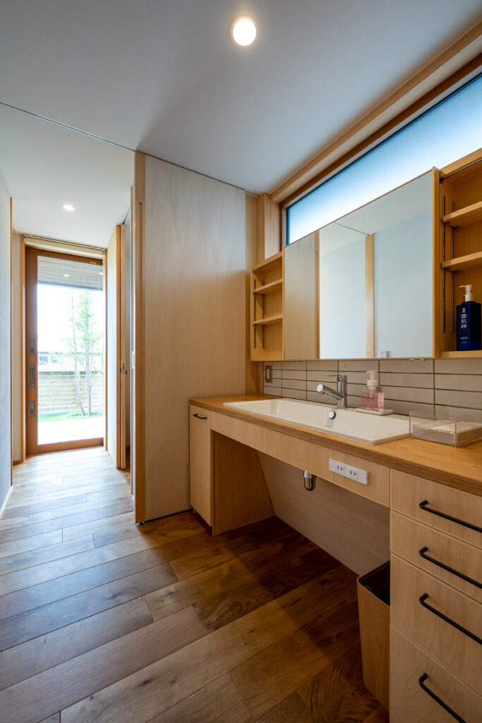 浴室・脱衣室・洗面所・トイレ・外物干し場と間仕切りの引き戸を開けると無駄のない一筆書き動線