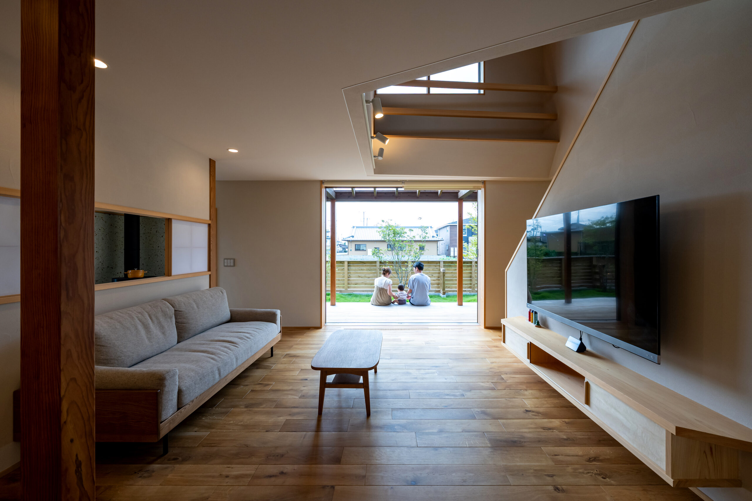 南庭に面した吹抜のある開放的でゆったりとしたリビング
