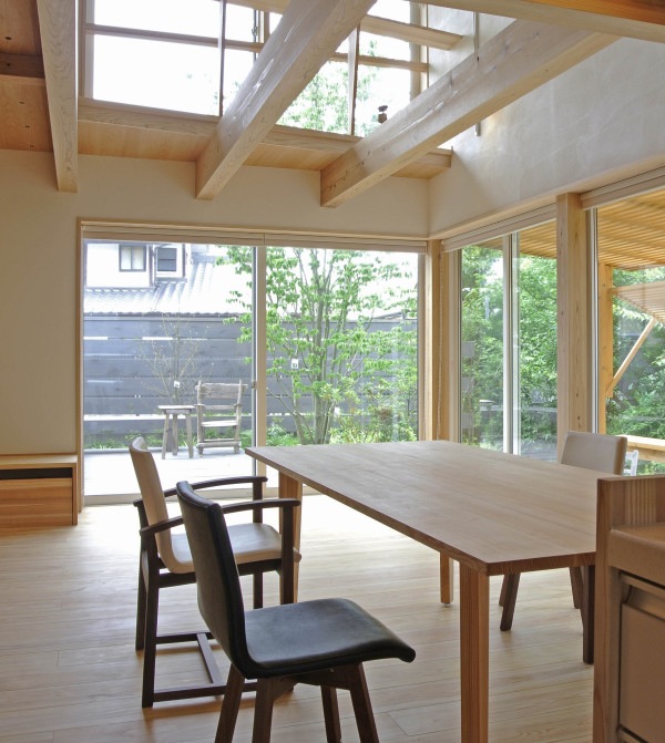 1階は、吹き抜けとコーナーの大きな開口部のあるワンルームである。冬は食堂の奥まで日が差し込む。食卓から樹木の幹から梢まで眺めることができる、伸びやかな空間である。戸外は、奥行きのあるウッドデッキ、木陰でのんびり楽しめるスペース。