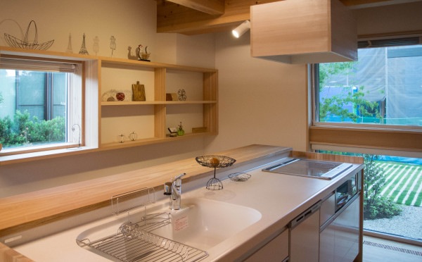 カウンターキッチンの正面には、小さな飾り窓がある。窓先にはアオダモを植えた。夏の日よけだけでなく、春の新緑、秋の紅葉が楽しみだ。右手に見えるグリーンのストライプは、駐車スペース。