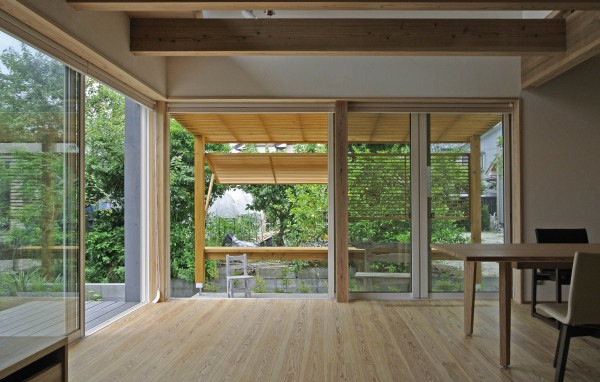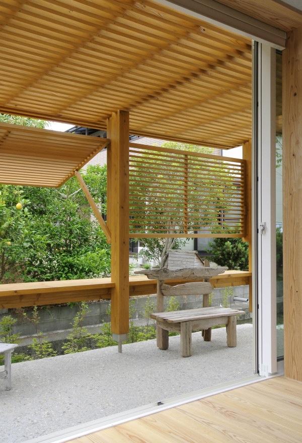 敷地の西側は、水路を隔てて隣家の緑が広がっている。それを借景として取り込んだ。問題は西日対策である。西側にサンルームを設け、木製ルーバーによる蔀戸(シトミド)を設置した。ルーバーの角度が変えられる簡単な仕掛けである。日差しを遮りながら風も視界も抜けることができる。