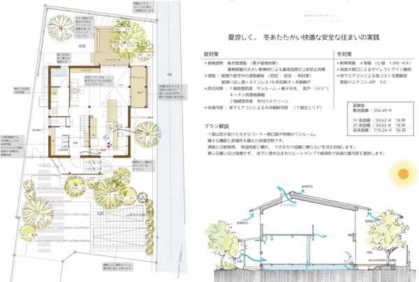 住まいの省エネは結果であって目的ではない。いかに心地よく快適に過ごせるかである。省エネの方法は、通気屋根、蓄熱容量の大きな屋根断熱による天井温度上昇防止、大開口部によるダイレクトゲイン、西日遮蔽の徹底、夜間・留守中の防犯通風確保、設計時における通年日射確認、等々。