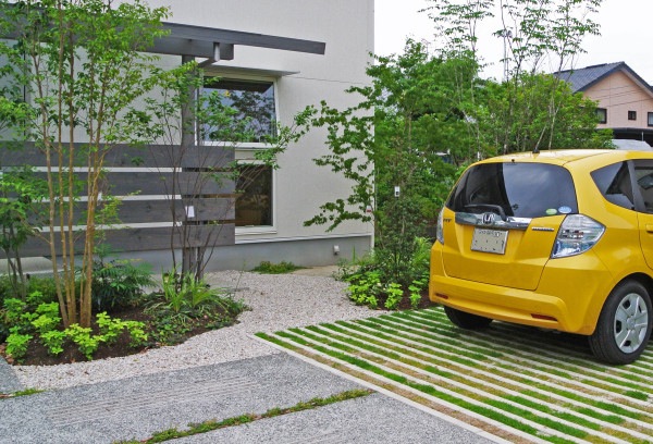 地方での生活は、駐車場は最低2台、来客のことを考えると3台分ほしくなる。これを舗装してしまうと夏の照り返しは相当なものだ。帯状に緑化して緑のスペースを増やした。