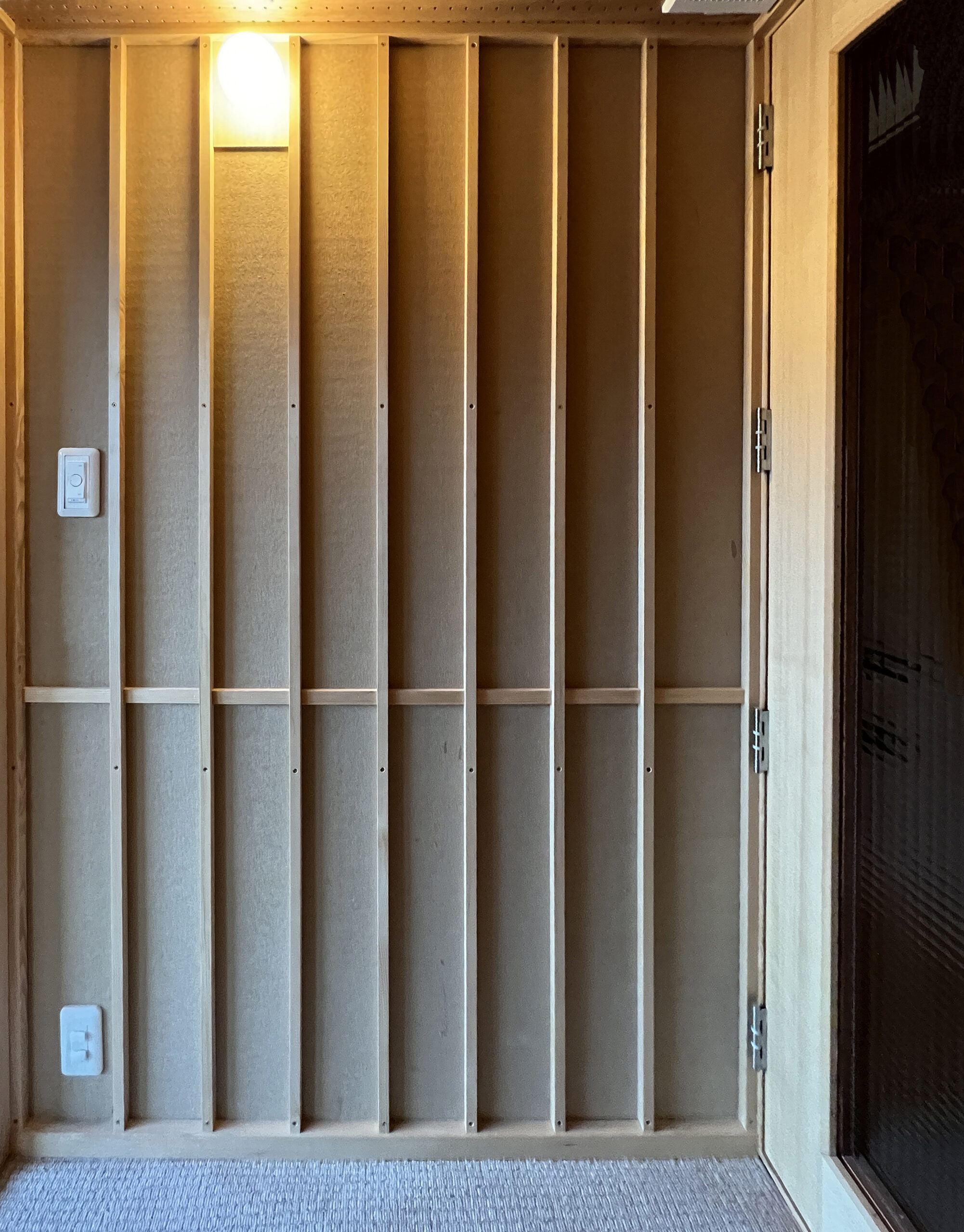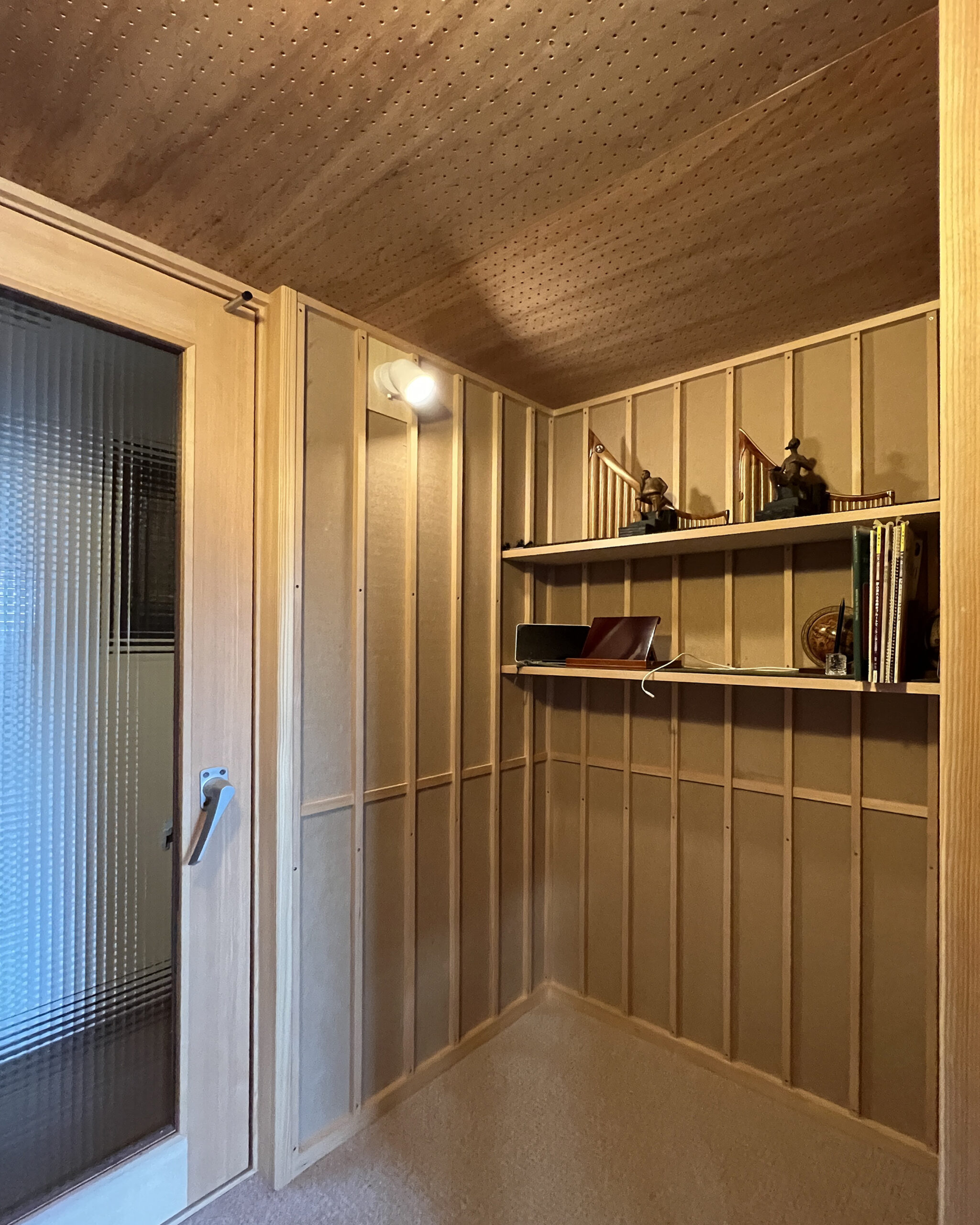床はカーペット、天井は穴あき吸音合板、壁は木質断熱材を押縁止め。