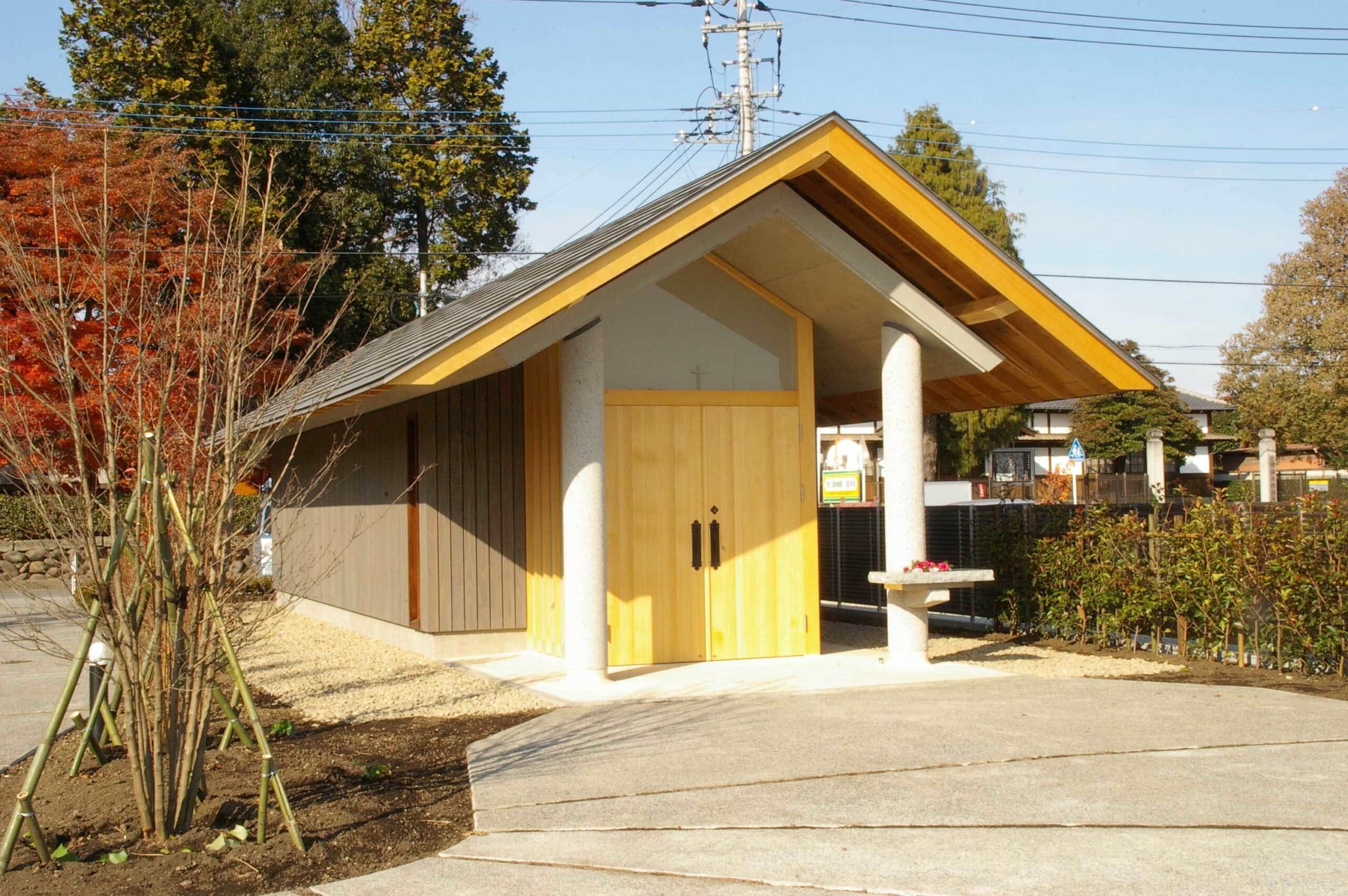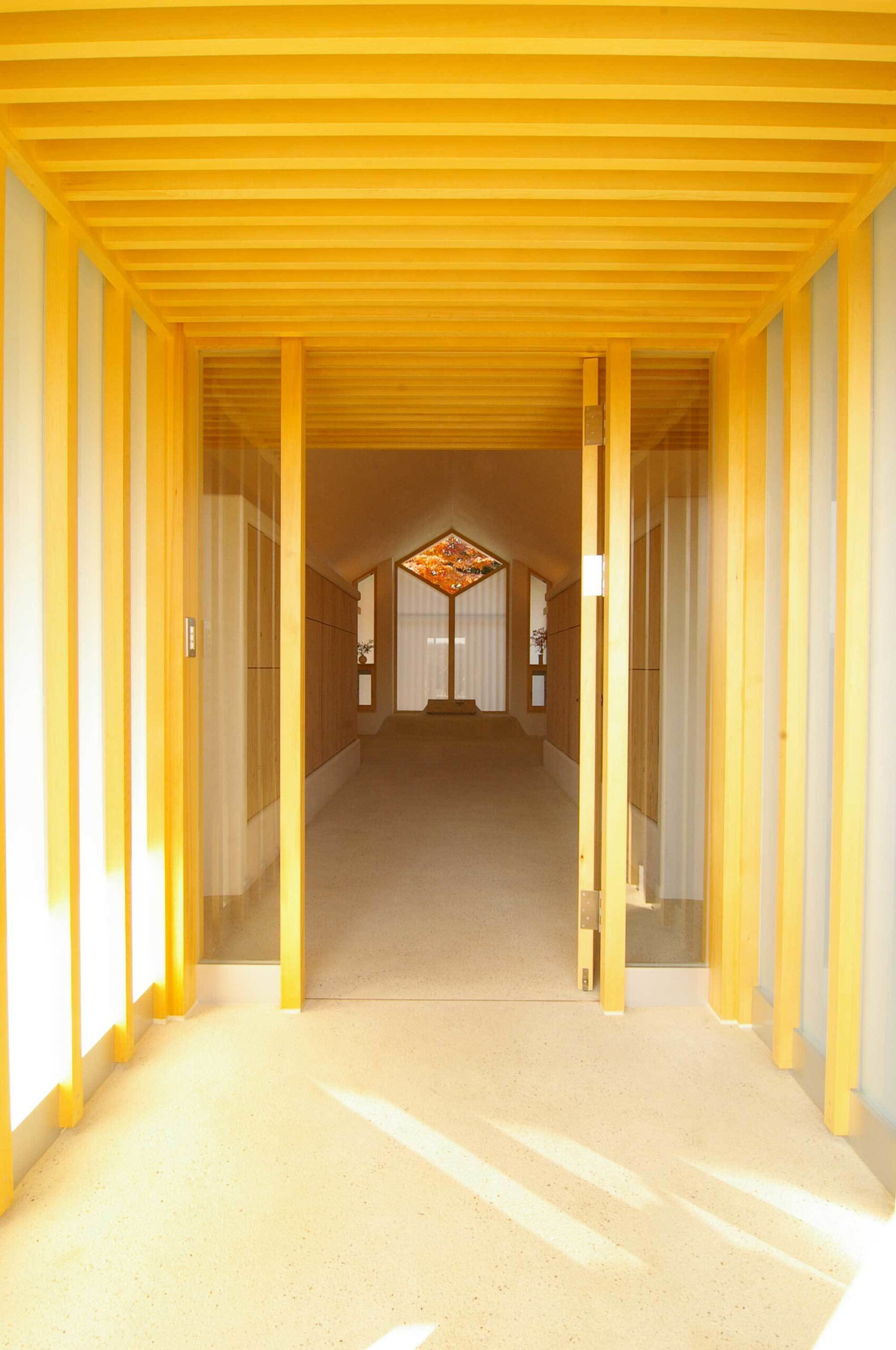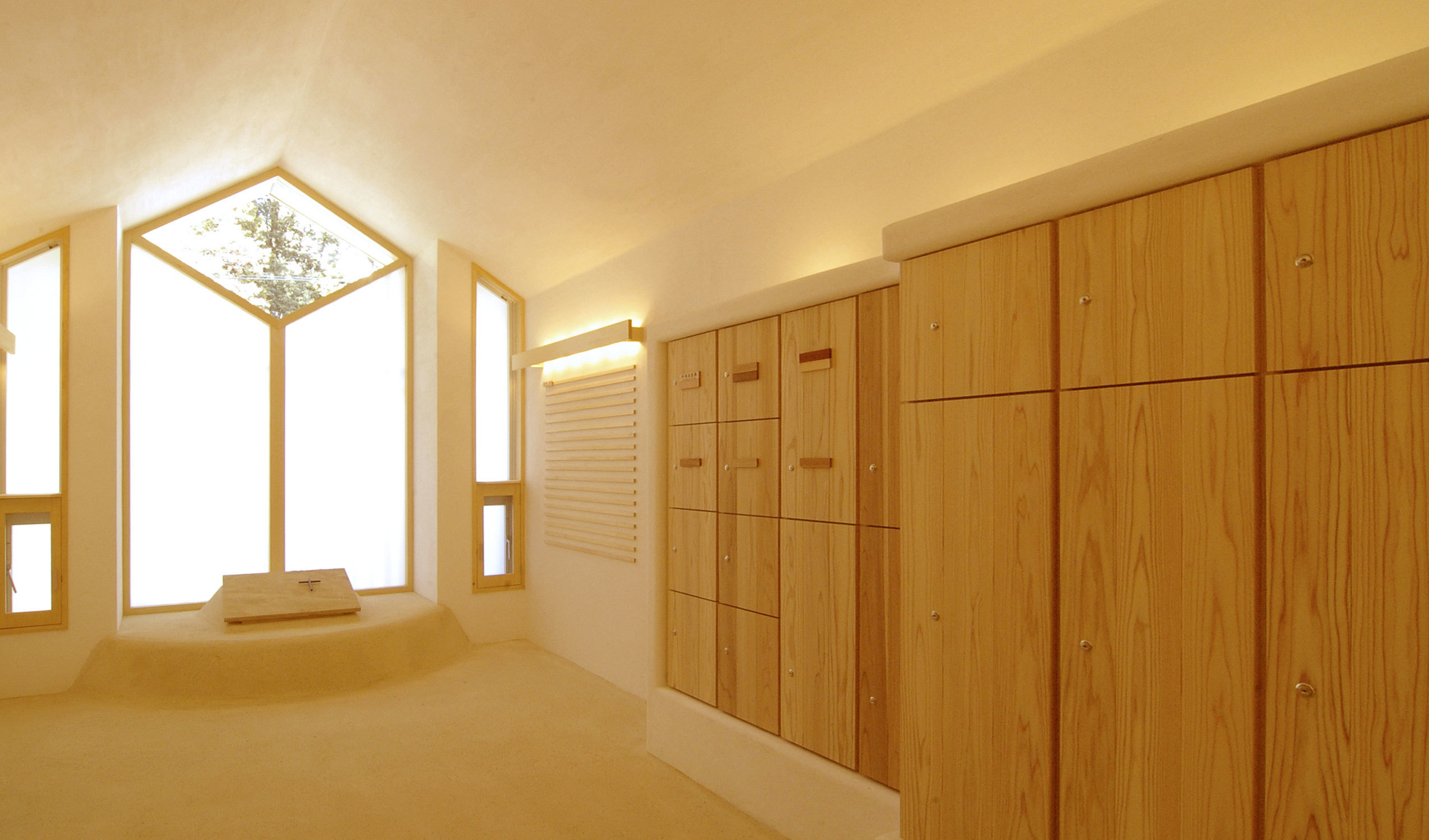 堂内は砂漆喰の白を基調とし、納骨棚は不燃処理された杉材で作られた。
