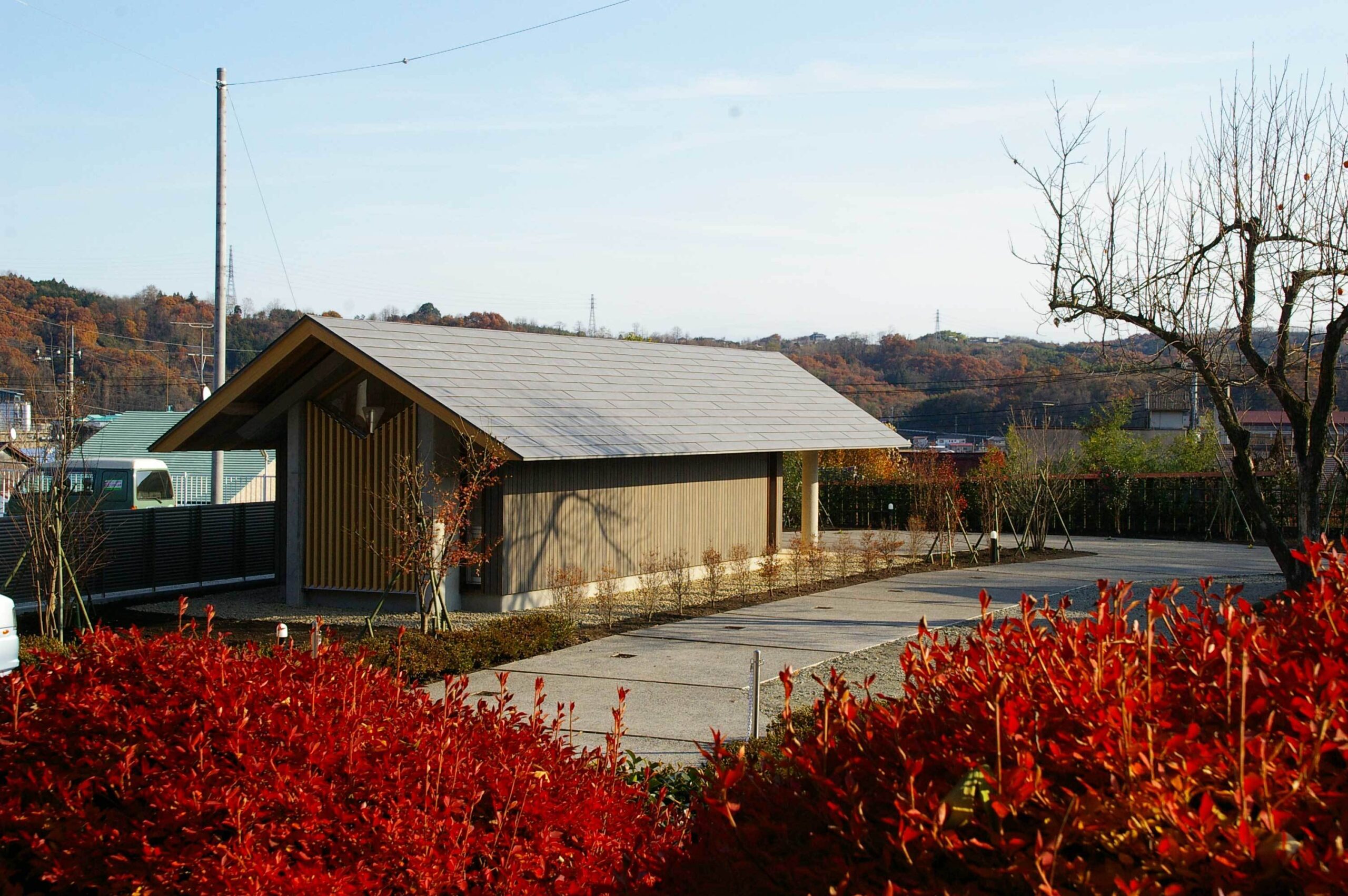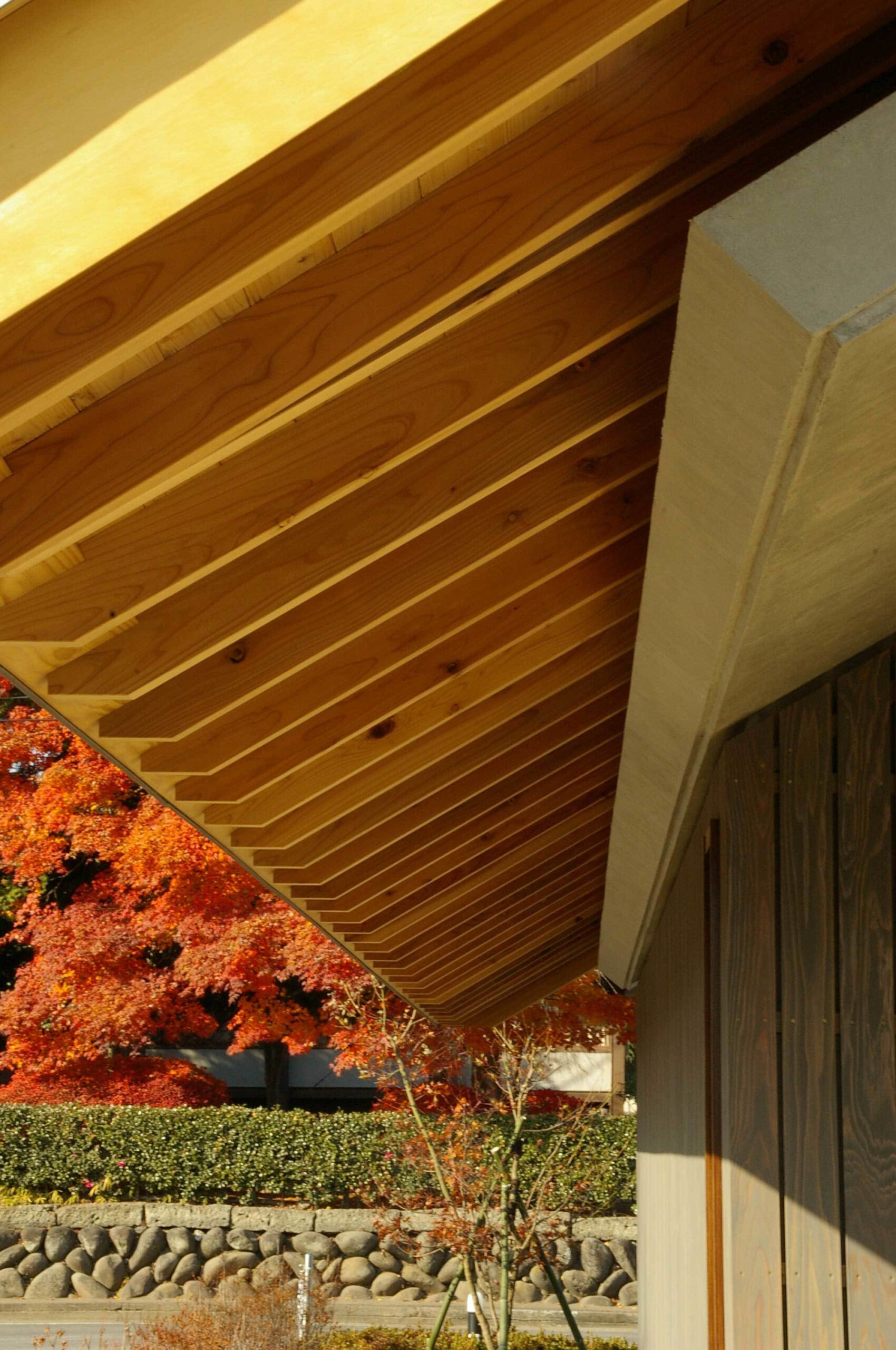 夏の日射によるコンクリートの蓄熱、堂内の気温上昇を防ぐために、木造の置き屋根を載せ、外壁にもRCの躯体に直接日射が当たらないよう杉板を外皮として取り付けた。